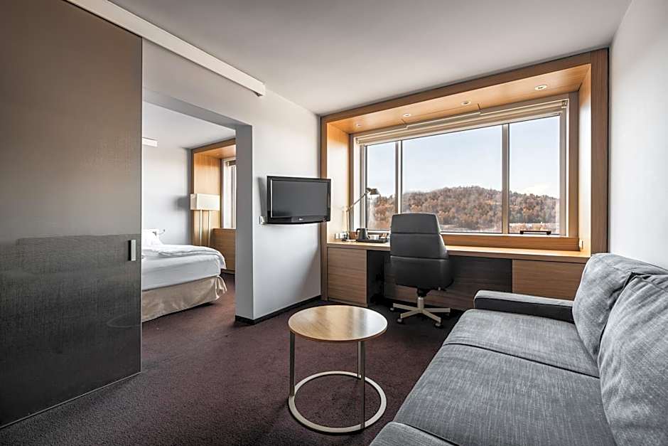 Elegantly furnished room with a king-size bed or 2 separate single beds, as well as a large work area and a view of the city.